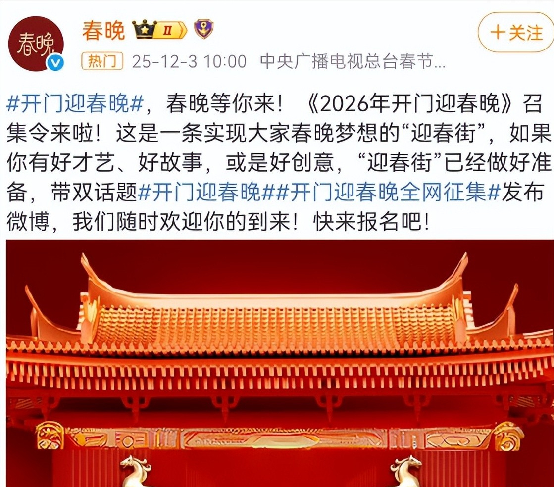 12月3日,春晚官方账号发布动态:“春晚等你来!”